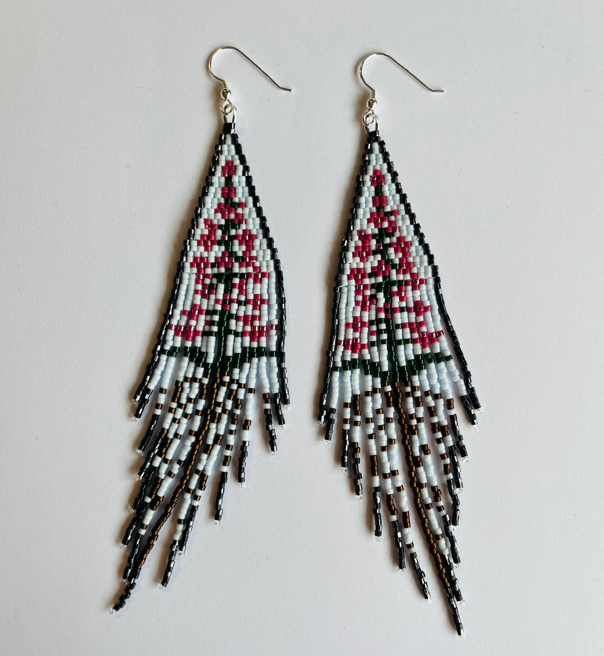 Fireweed with roots long fringe earrings. White background and dark grey trim.